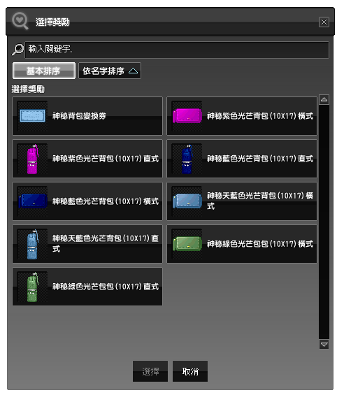 內含神秘背包的箱子.使用時,可選擇並確定獲得各式道具其中1種.