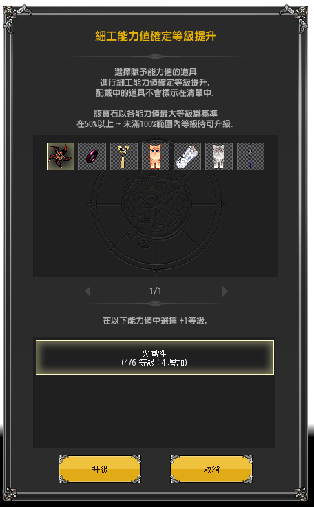 可選擇能夠使用細工道具中選擇1個,能提升1等級,使用過裝備之後限制追加細工選項等級強化。配戴中的裝備不會顯示在清單中。